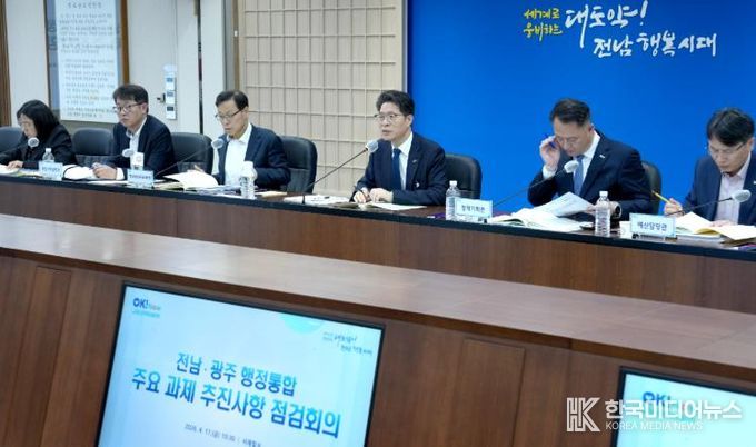 [ 한국미디어뉴스 이종철 기자 ] 전라남도는 17일 도청 서재필실에서 전남·광주 행정통합 주요 과제 추진상항 점검회의를 열어 오는 7월 1일 출범하는 전남광주통합특별시의 성공적 탄생에 총력을 기울이기로 했다.