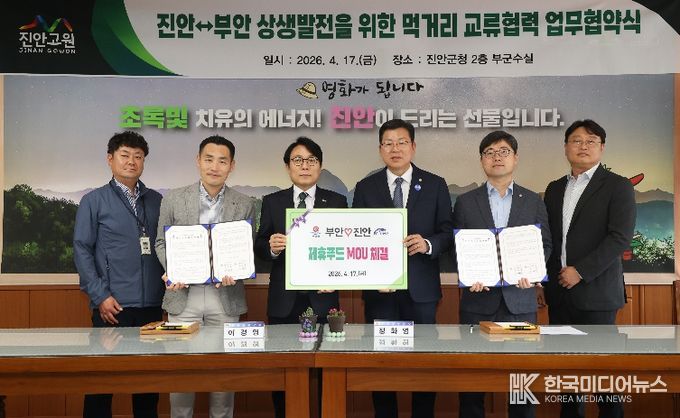 [ 한국미디어뉴스 이종철 기자 ] 진안군은 17일 군청 부군수실에서 부안군과 지역 먹거리 상생발전 및 교류 협력 강화를 위한 업무협약(MOU)을 체결했다.
