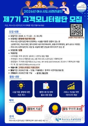 [ 한국미디어뉴스 이종철 기자 ] 여수시도시관리공단은 시민 참여를 기반으로 공단 시설과 서비스 품질을 점검하고 개선하기 위한 '2026년 제7기 고객모니터링단'을 모집한다고 밝혔다.