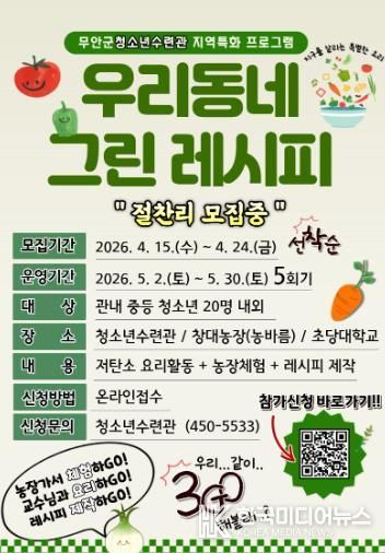 무안군청소년수련관은 ‘우리동네 그린레시피’ 프로그램 참가자를 오는 4월 24일까지 모집한다고 밝혔다.