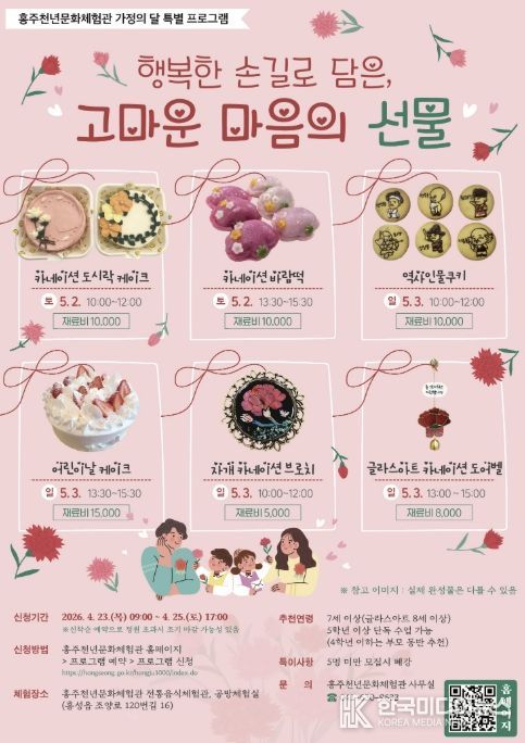 [ 한국미디어뉴스 이원영 기자 ] 홍성군 홍주천년문화체험관은 가정의 달을 맞아 오는 5월 2일부터 3일까지 이틀간 특별 프로그램 “행복한 손길로 담은 고마운 마음의 선물”을 운영한다.