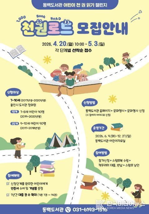 [ 한국미디어뉴스 김일규 기자 ] 용인특례시 동백도서관은 어린이 천 권 읽기 챌린지 ‘천권로드(ROAD)’ 참여자를 모집한다고 20일 밝혔다.