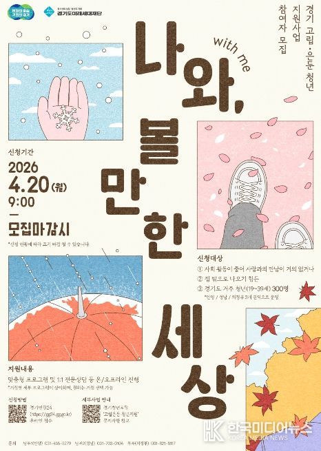 [ 한국미디어뉴스 김일규 기자 ] 경기도가 사회적 관계가 단절된 고립·은둔 청년의 일상 회복을 돕기 위해 20일부터 ‘경기 고립·은둔 청년 지원사업: 나와(with me), 볼만한 세상’ 참여자 300명을 모집한다.