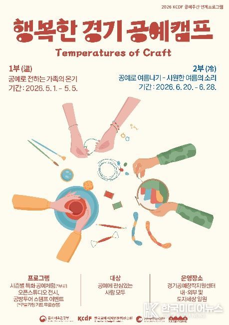 [ 한국미디어뉴스 김일규 기자 ] 한국도자재단이 오는 5월 1일부터 경기공예창작지원센터(여주) 일원에서 체험·전시·이벤트를 결합한 참여형 프로그램 ‘2026 행복한 경기 공예 캠프’를 개최한다.