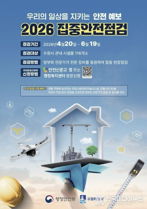 [ 한국미디어뉴스 김일규 기자 ] 수원특례시가 안전사고를 예방하고, 시민의 안전 의식을 고취하기 위해 20일부터 6월 19일까지 ‘2026년 집중안전점검’을 한다.