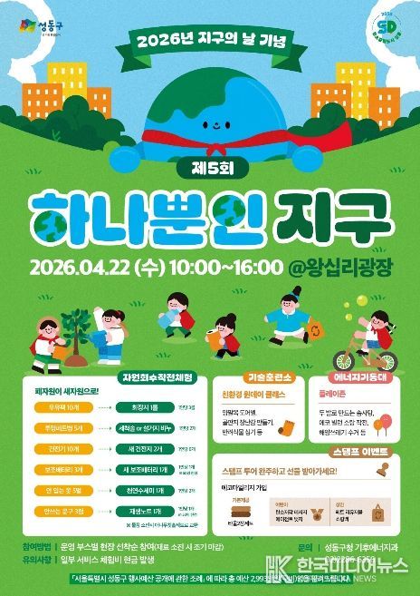[ 한국미디어뉴스 이원영 기자 ] 서울 성동구는 오는 4월 22일 왕십리광장에서 기후위기의 심각성을 알리고 탄소중립 실천 문화를 확산하기 위한 ‘제5회 하나뿐인 지구’ 행사를 개최한다고 밝혔다.