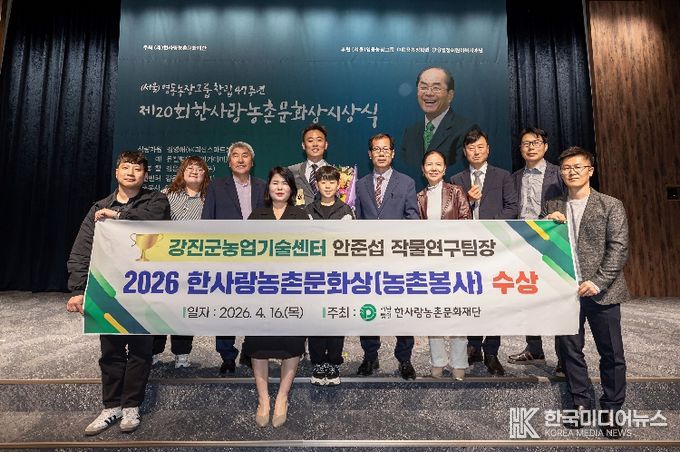 [ 한국미디어뉴스 이종철 기자 ] 강진군은 한사랑농촌문화재단이 주관하는 ‘한사랑농촌문화상’ 농촌봉사 부문에서 강진군 농업기술센터 안준섭 작물연구팀장이 수상의 영예를 안았다고 20일 밝혔다.