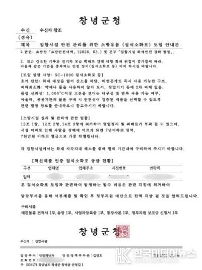 [ 한국미디어뉴스 최정화 기자 ] 창녕군은 공무원을 사칭해 관내 장례식장에 소방용품(질식소화포) 구매를 요구하는 보이스피싱 사례가 발생했다고 밝혔다.