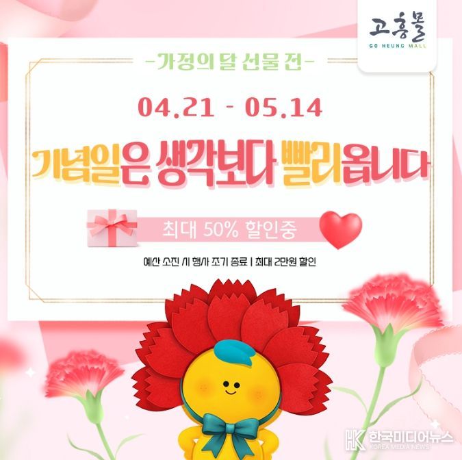 [ 한국미디어뉴스 이종철 기자 ] 고흥군이 운영하는 온라인 쇼핑몰 ‘고흥몰’은 4월 21일부터 5월 14일까지 ‘가정의 달 선물전’을 열고, 인기 농수특산물과 선물 세트를 최대 50% 할인된 가격에 선보인다고 밝혔다.