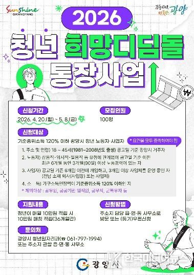 [ 한국미디어뉴스 이종철 기자 ] 광양시는 전라남도와 함께 청년의 자산 형성과 미래 준비를 지원하기 위해 ‘2026년 청년 희망디딤돌 통장사업’ 참여자를 모집한다고 밝혔다.