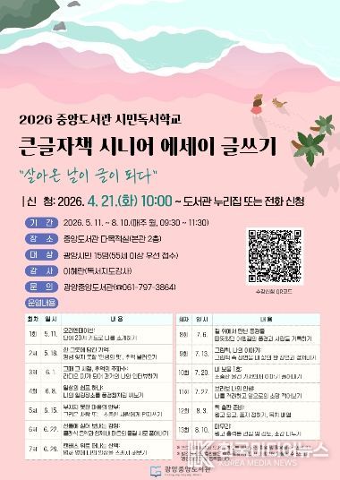 [ 한국미디어뉴스 이종철 기자 ] 광양중앙도서관은 2026년 시민독서학교의 하나로 '큰글자책 시니어 에세이 글쓰기' 프로그램을 운영하고 참여자를 모집한다고 밝혔다.