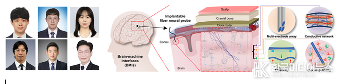 [ 한국미디어뉴스 기동취재 기자 ] 파킨슨병이나 뇌전증 같은 난치성 신경 질환을 진단하고 치료하기 위해서는 뇌와 외부 기기를 연결하는 ‘뇌 인터페이스’ 기술이 필수적이다. 하지만 기존의 실리콘 기반 전극은 딱딱한 특성 때문에 부드러운 뇌 조직에 상처를 입히고 염증을 일으켜 장기간 사용이 어렵다는 한계가 있었다. 이러한 문제를 해결하기 위해 연세대학교(이태윤, 유기준 교수) / 고려대학교(조일주 교수) / 인천대학교(조영욱 교수) 연구팀은 뇌 조직만큼 부드러우면서도 전기적 성능이 뛰어난 ‘올오가닉(All-organic) PEDOT:PSS 섬유 미세전극(PFME)’을 개발했다고 밝혔다. 연구팀은 전도성 고분자인 PEDOT:PSS를 활용하여 섬유 형태의 전극을 제작했다. 특히 연구팀이 고안한 ‘아스코르브산 + 아세톤 Wet spinning’ 공법은 열처리 없이도 섬유 내부의 불필요한 성분을 선택적으로 제거하고 전도성 분자들을 정렬시킴으로써, 기계적 유연성과 전기적 성능이라는 두 마리 토끼를 모두 잡는 데 성공했다. 개발된 전극은 기존 섬유 전극들보다 수십 배 낮은 임피던스(전기 저항)와 높은 전하 저장 용량을 나타내어 미세한 뇌 신호를 정밀하게 포착할 수 있고, 동시에 굽힘 강도는 매우 낮아 뇌의 미세한 움직임에 맞춰 유연하게 반응하며 조직 손상을 방지할 수 있었다.