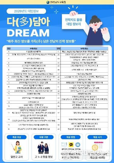 [ 한국미디어뉴스 이종철 기자 ] 전라남도교육청이 급변하는 대입 환경에 선제적으로 대응하고 학교 현장의 진학지도 역량을 강화하기 위해 맞춤형 대입 정보지 ‘다(多)담아 DREAM’을 발간·운영한다.