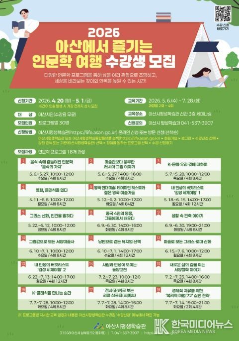 [ 한국미디어뉴스 이원영 기자 ] 아산시는 시민들이 다채로운 인문학적 경험을 통해 삶의 궤적을 성찰하고, 세상을 해석하는 통찰력을 기를 수 있도록 돕는 '2026 아산에서 즐기는 인문학 여행' 수강생을 모집한다.