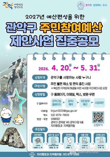 [ 한국미디어뉴스 이보영 기자 ] 관악구가 지역사회 문제를 해소하고 주민 편익을 증진하기 위해 ‘2026년도 주민참여예산사업 및 협치의제’ 공모를 실시한다.