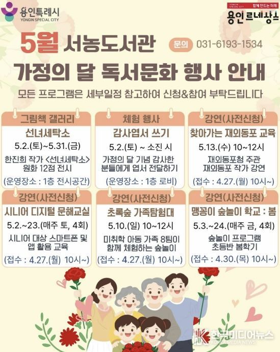[ 한국미디어뉴스 김일규 기자 ] 용인특례시 서농도서관은 오는 5월 가정의 달을 맞아 다양한 세대를 아우르는 프로그램으로 이뤄진 ‘2026년 5월 독서문화행사’를 마련했다고 21일 밝혔다.
