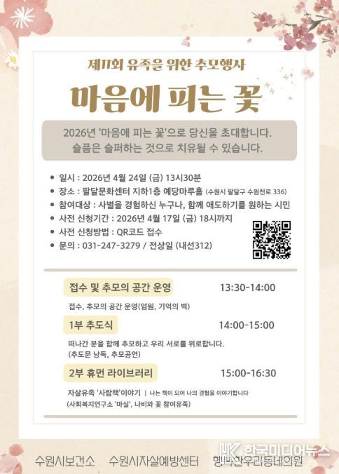 장안구보건소 관계자는 “슬프고 그리운 감정을 자연스럽게 표현하고 나눌 때 비로소 회복과 치유가 시작된다”며 “건강한 애도 문화 형성으로 유족들의 고통을 완화할 수 있도록 추모행사에 많은 관심을 바란다”고 말했다.