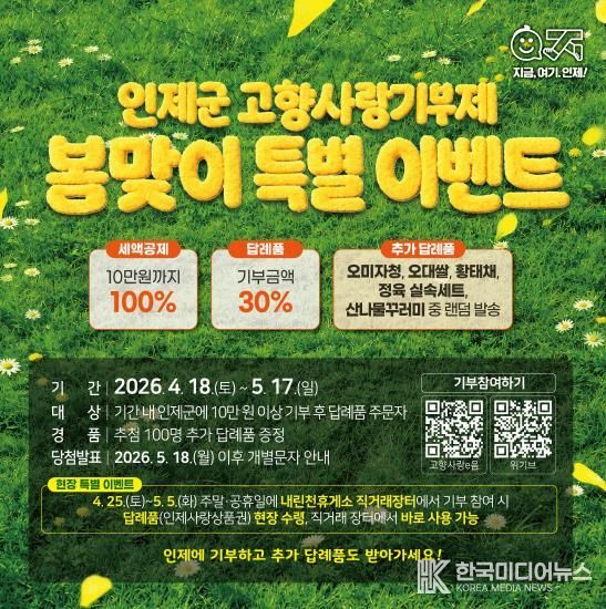 김장웅 인제군 지역발전과장은 “봄철 인제군을 찾는 방문객들에게 고향사랑기부제를 자연스럽게 알리고 참여를 독려하기 위해 이번 이벤트를 마련했다”며, “고향을 사랑하는 마음으로 기부하고 세액공제와 답례품 혜택은 물론, 지역 농특산물 소비 활성화에도 동참하는 뜻깊은 기회가 되길 바란다”고 말했다.