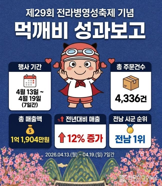 강진군은 지난 13일부터 19일까지 진행된 병영성축제 기념 먹깨비 할인이벤트를 통해 총 주문 건수 4,336건, 총매출액 1억 1,904만 원을 기록하며 성공적인 성적표를 받아들었다고 밝혔다.