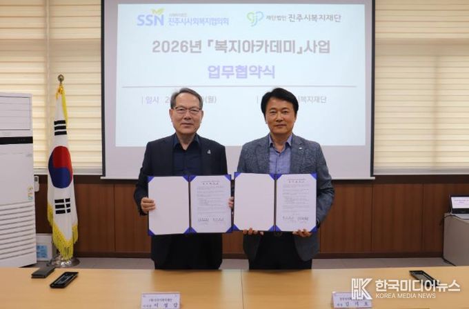[ 한국미디어뉴스 김홍철 기자 ] 진주시복지재단은 지난 20일 재단 회의실에서 진주시사회복지협의회(회장 김기호)와 ‘2026년 복지아카데미 교육 및 사례관리 교육사업’ 운영을 위한 업무협약을 체결했다.