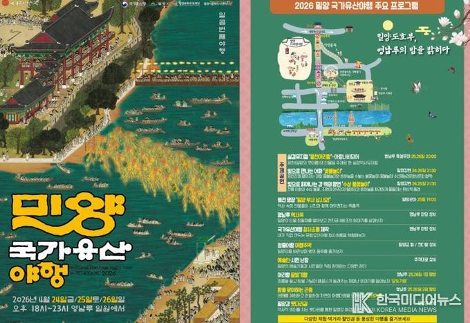 [ 한국미디어뉴스 최정화 기자 ] 경남 밀양시가 주최하고 밀양시문화도시센터가 주관하는 ‘2026 밀양 국가유산 야행’이 오는 4월 24일부터 26일까지 3일간 영남루 및 밀양관아, 밀양강 일원에서 펼쳐진다.