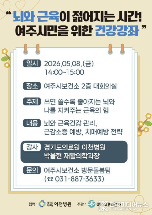 [ 한국미디어뉴스 이원영 기자 ] 여주시보건소 건강증진과는 오는 5월 8일 오후 2시, 보건소 2층 대회의실에서 여주시민을 위한 건강강좌 '뇌와 근육이 젊어지는 시간!'을 개최한다고 밝혔다.