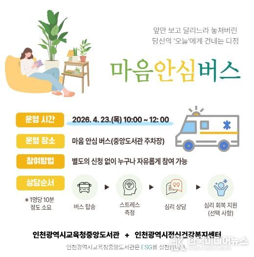[ 한국미디어뉴스 이원영 기자 ] 인천광역시교육청중앙도서관은 오는 23일, 인천정신건강복지센터와 협력하여, 지역 시민들을 위한 찾아가는 마음 돌봄 서비스인 ‘마음안심버스’를 운영한다.