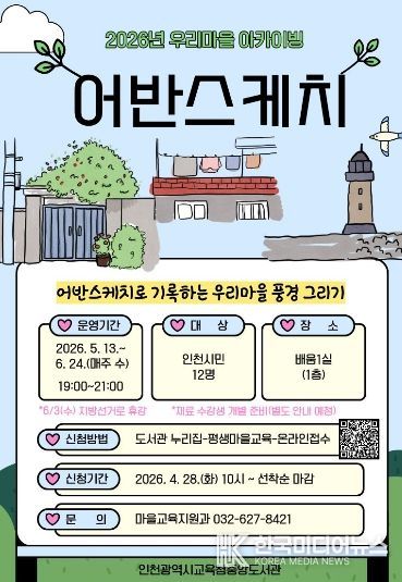 [ 한국미디어뉴스 이원영 기자 ] 인천광역시교육청중앙도서관은 2026년도 마을교육 아카이빙 사업의 일환으로, 5월 13일부터 ‘우리 마을 아카이빙, 어반스케치’ 프로그램을 운영한다.