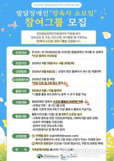 [ 한국미디어뉴스 이원영 기자 ] 인천시사회서비스원 소속 인천장애인종합복지관은 ‘발달장애인 양육자 소모임’ 참여자를 모집한다고 21일 밝혔다.