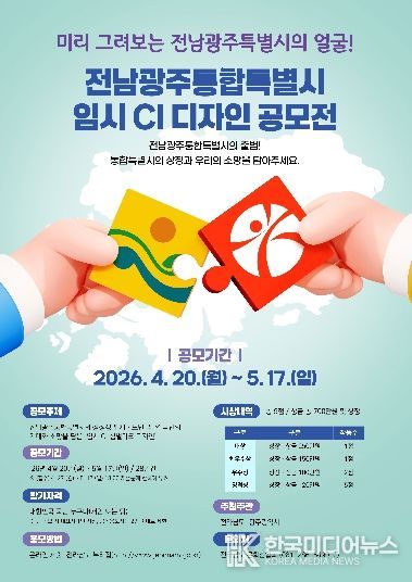 [ 한국미디어뉴스 이종철 기자 ] 전라남도와 광주광역시는 통합특별시의 상징성을 나타내는 전남광주통합특별시 임시 CI 디자인을 5월 17일까지 28일간 전국민을 대상으로 공모한다고 밝혔다.