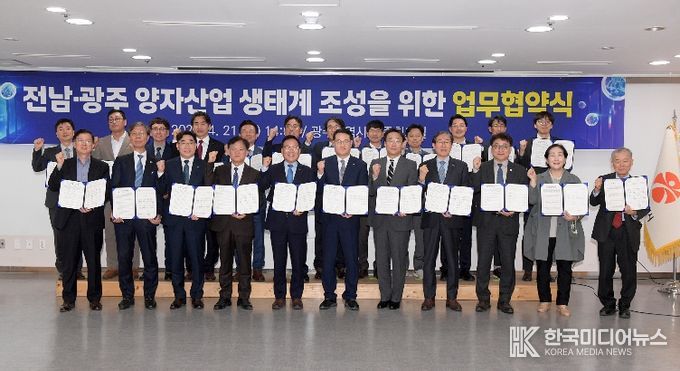 광주광역시와 전라남도는 21일 시청 중회의실에서 대학, 연구기관, 기업 등 23개 기관이 참여하는 ‘광주·전남 양자산업 생태계 조성을 위한 업무협약식’을 개최했다.