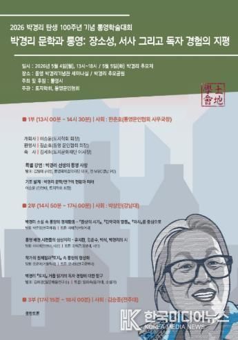 [ 한국미디어뉴스 김홍철 기자 ] 통영시는 한국 문학의 거목 박경리 선생 탄생 100주년을 맞아 오는 5월 4일 오후 1시 박경리기념관 세미나실에서 통영문인협회와 토지학회가 공동 주관하는 ‘2026 박경리 탄생 100주년 기념 통영학술대회’를 개최한다.