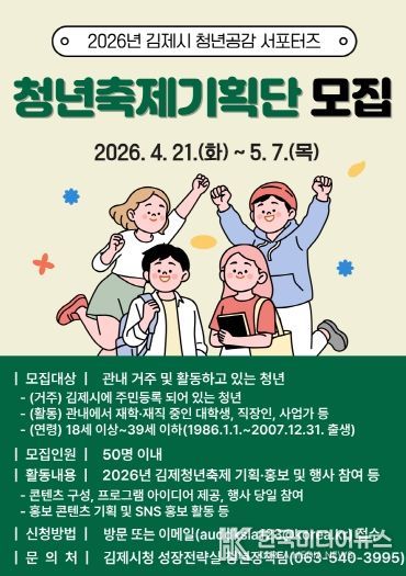 [ 한국미디어뉴스 이종철 기자 ] 김제시는 청년이 주도하는 축제 기획을 통해 지역 청년 참여를 확대하고 활력을 불어넣고자 '청년축제기획단(김제시 청년공감 서포터즈)'을 모집한다고 밝혔다.