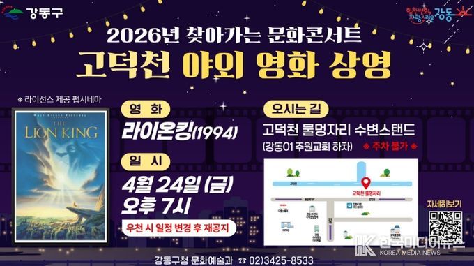 [ 한국미디어뉴스 이원영 기자 ] 서울 강동구는 오는 24일 오후 7시, 고덕천 물멍자리 수변스탠드(주원교회 맞은편)에서 ‘2026년 찾아가는 문화콘서트’ 3회차 프로그램으로 미디어파사드를 활용한 야외 영화 상영을 진행한다고 밝혔다.