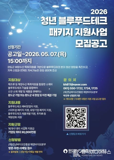 [ 한국미디어뉴스 이종철 기자 ] 완도군은 지역의 해양 수산 자원을 고부가가치로 전환하고 청년 창업을 돕기 위해 ‘2026년도 청년 블루푸드테크 패키지 지원 사업’ 참가자를 모집한다.