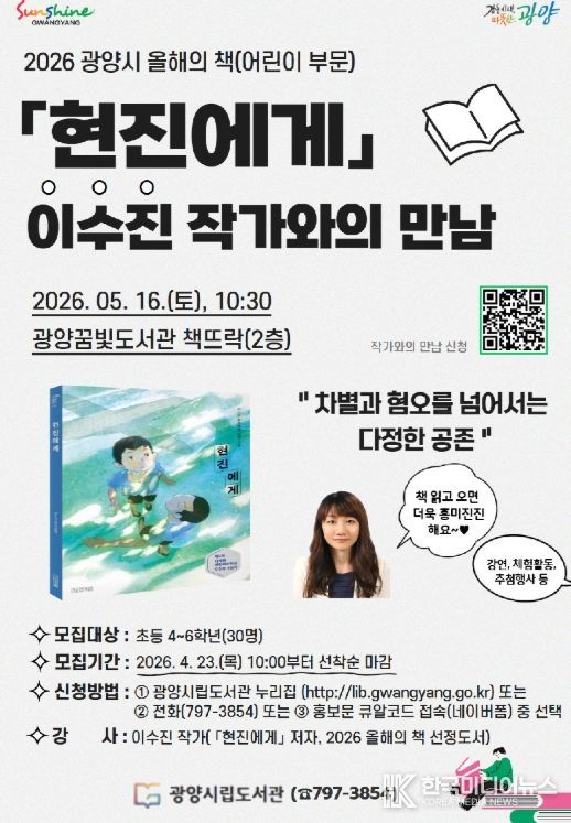 [ 한국미디어뉴스 이종철 기자 ] 광양시는 오는 5월 16일 오전 10시 30분 꿈빛도서관에서 ‘2026년 올해의 책’ 어린이 부문 선정 도서'현진에게'의 저자 이수진 작가를 초청해 강연을 연다고 밝혔다.