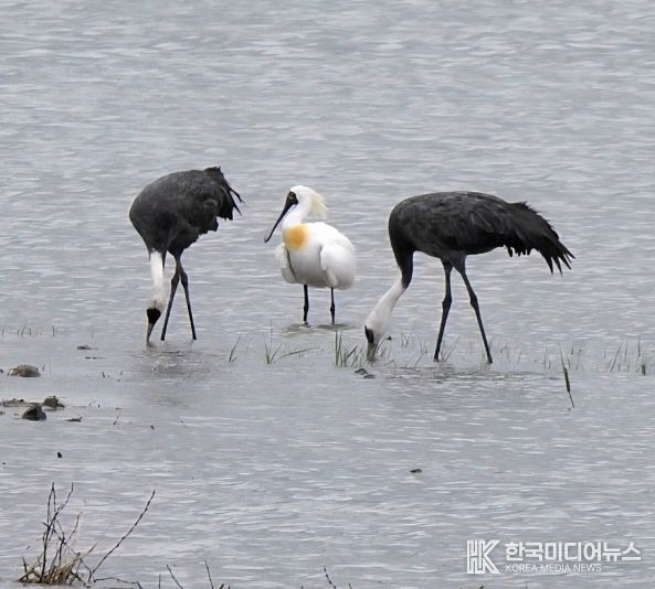 [ 한국미디어뉴스 이종철 기자 ] 지난 20일 순천만 복원습지에서 겨울철새인 흑두루미 한 쌍과 여름철새인 저어새가 한 장면에 포착됐다.