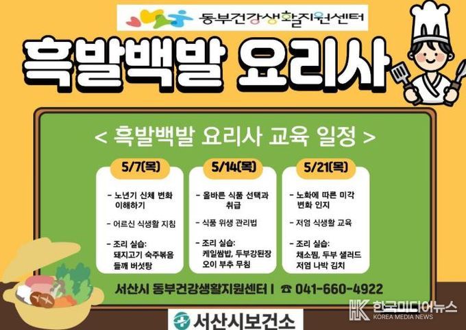 [ 한국미디어뉴스 이원영 기자 ] 서산시 보건소 동부건강생활지원센터에서 60세 이상 남성어르신을 대상으로 건강한 식생활 실천과 자가 건강관리 능력 향상을 위해 '흑발백발 요리사' 프로그램 대상자를 모집한다고 밝혔다.