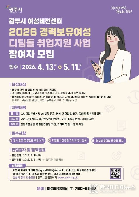 [ 한국미디어뉴스 이보영 기자 ] 광주시는 지역 내 경력보유여성의 사회 재진출과 취업 역량 강화를 위해 ‘2026 경력보유여성 디딤돌 취업 지원 사업’ 참여자를 오는 5월 11일까지 모집한다고 22일 밝혔다.