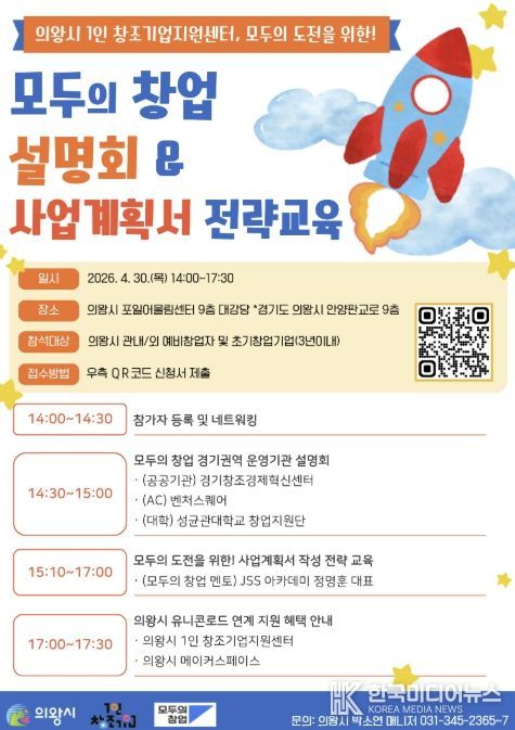 [ 한국미디어뉴스 이보영 기자 ] 의왕시 1인 창조기업지원센터는 4월 30일, 창업을 희망하는 예비 및 초기 창업자를 대상으로 ‘모두의 창업’ 설명회 및 전략 교육을 개최한다.