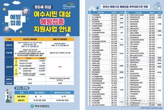 [ 한국미디어뉴스 이종철 기자 ] 여수시는 65세 이상(1961. 12. 31. 이전 출생자) 여수 시민을 대상으로 폐렴구균 및 대상포진 예방접종 비용을 지원한다고 밝혔다.