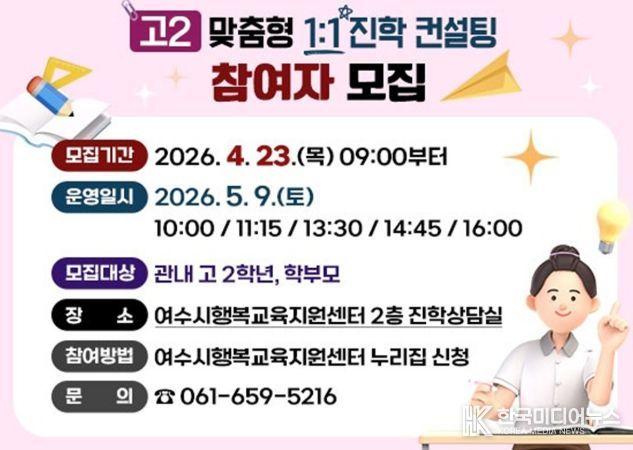 [ 한국미디어뉴스 이종철 기자 ] 여수시는 관내 고2 학생과 학부모를 위해 오는 5월 9일 토요일 여수시행복교육지원센터에서 ‘고2 맞춤형 1:1 진학 컨설팅’을 운영한다고 밝혔다.