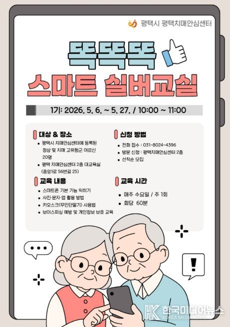 [ 한국미디어뉴스 이보영 기자 ] 평택치매안심센터는 오는 5월 6일부터 27일까지 치매 예방 및 인지 기능 강화를 위한 ‘똑똑똑 스마트 실버교실’을 운영한다고 밝혔다.