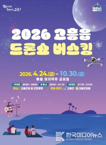 [ 한국미디어뉴스 이종철 기자 ] 고흥군은 ‘2026 고흥읍 드론쇼 버스킹 공연’을 오는 4월 24일부터 10월 24일까지 7개월간 매월 마지막 주 금요일 고흥군청 앞 군민광장에서 개최한다고 밝혔다.