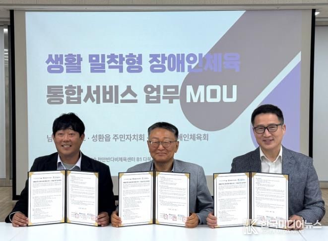 [ 한국미디어뉴스 이원영 기자 ] 천안시장애인체육회는 22일 천안반다비체육센터에서 성환읍 주민자치회, 남서울대학교와 ‘생활밀착형 장애인체육 통합서비스 구축을 위한 업무협약’을 체결했다.