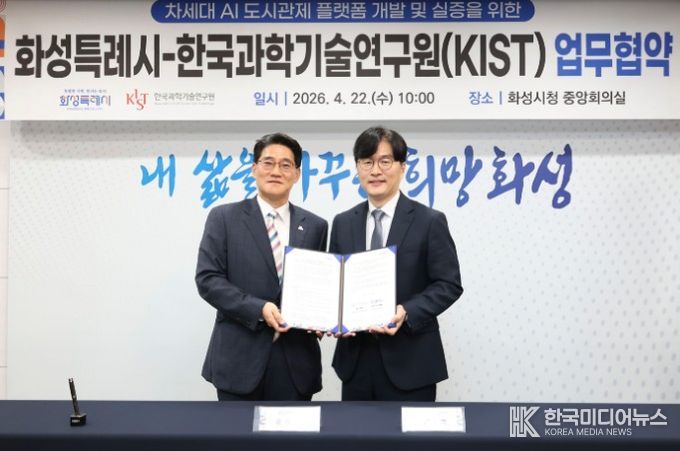 [ 한국미디어뉴스 이원영 기자 ] 화성특례시는 도시상태정의 기반의 AI 도시관제 체계로의 전환에 본격 착수했다. 시는 22일 한국과학기술연구원(KIST)과 ‘차세대 AI 도시관제 플랫폼 개발 및 실증’을 위한 업무협약(MOU)을 체결했다.
