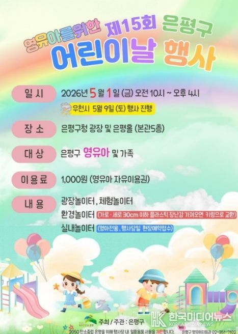 [ 한국미디어뉴스 이보영 기자 ] 서울 은평구는 어린이날을 맞아 내달 1일 은평구청 광장과 은평홀에서 ‘제15회 영유아를 위한 어린이날 행사’를 개최한다고 밝혔다.