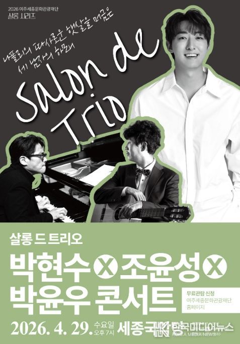 [ 한국미디어뉴스 이원영 기자 ] 여주세종문화관광재단이 오는 29일, 문화가 있는 날을 맞아 2026년 특별기획 살롱 시리즈의 세 번째 무대 '살롱 드 트리오 박현수X조윤성X박윤우 콘서트'를 세종국악당에서 개최한다.