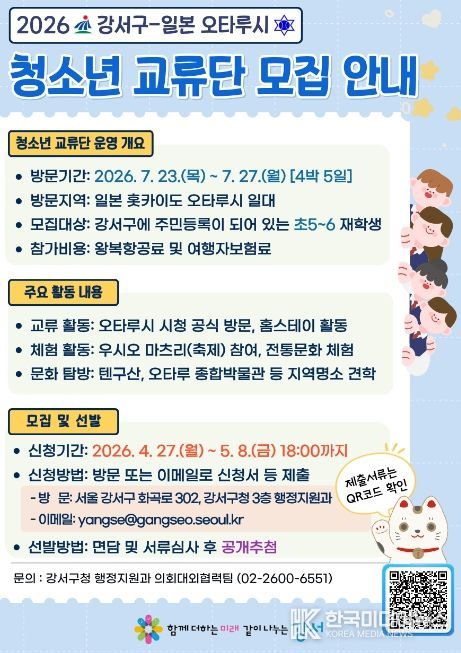 [ 한국미디어뉴스 이보영 기자 ] 서울 강서구는 자매도시인 일본 오타루시와의 우호를 강화하고, 지역 청소년에게 특별한 해외 문화 체험의 기회를 제공하기 위해 ‘강서구-오타루시 청소년 교류단’ 참가자를 모집한다고 밝혔다.
