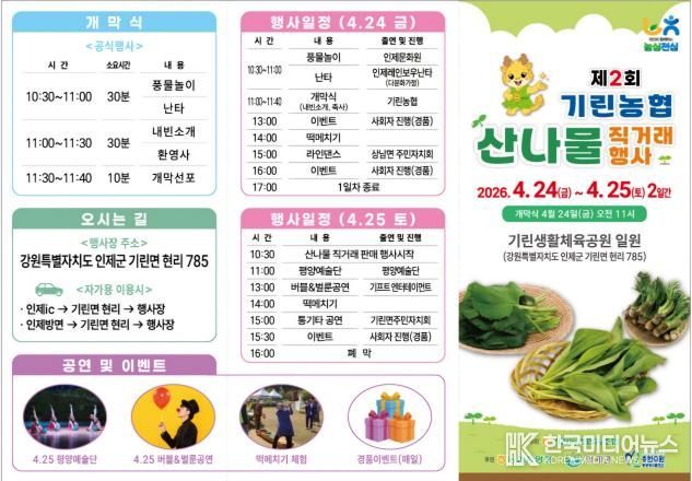 기린농협 관계자는 “이번 산나물 직거래 행사가 지역 농가에 실질적인 도움이 되고, 인제 산나물의 우수성을 널리 알리는 계기가 되길 바라며, 많은 주민과 관광객이 행사장을 찾아 신선한 산나물과 다양한 프로그램을 함께 즐기시길 기대한다”고 말했다.